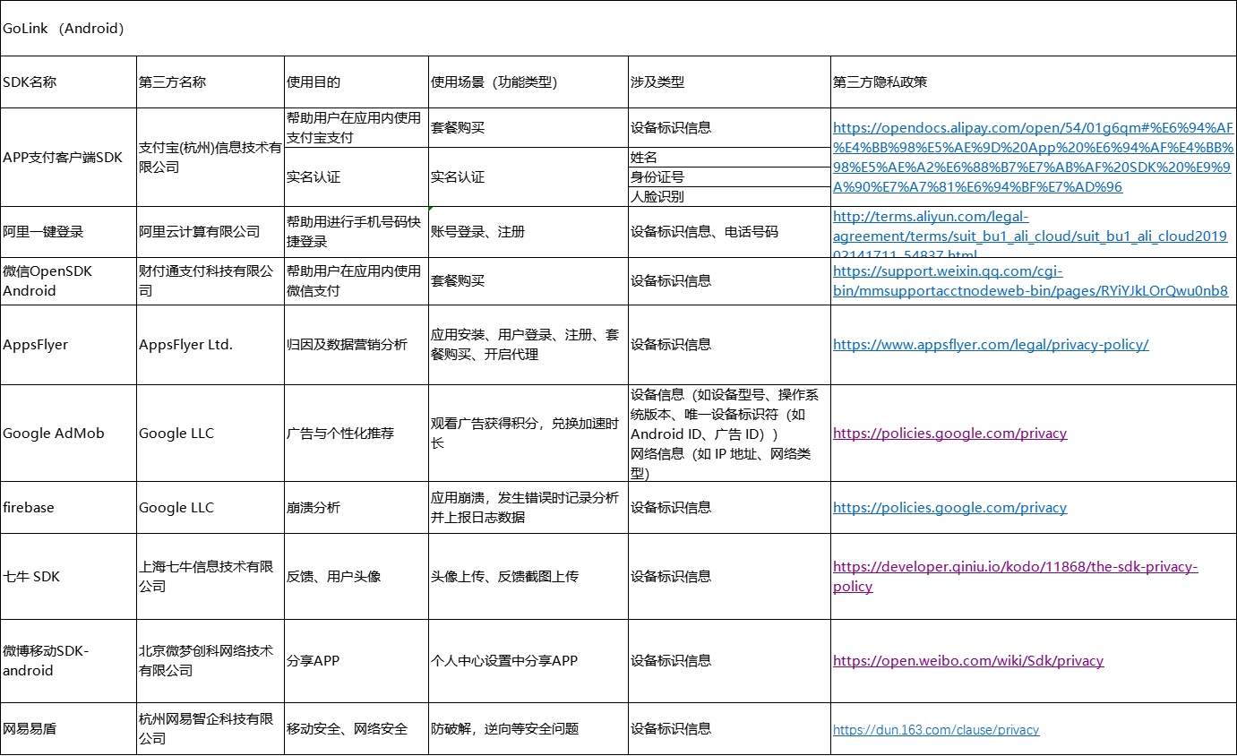 a.实名认证功能:若您成为GoLink的用户,为了完成认证流程,我们需要接入“支付宝”的实名认证流程,您可以在【个人中心】进行相关认证流程。如果拒绝提供将无法使用【加速】等相关功能,但不影响其他功能的正常使用。
